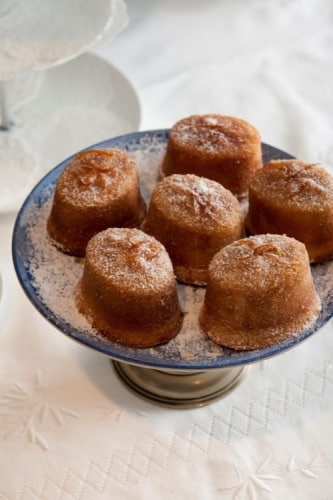 Arrange 2 or 3 strands of the zested peel on the top of each cake and very lightly dust all over with icing sugar.